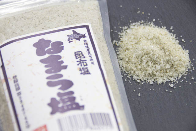 江戸時代から伝わる製法で2か月以上陰干して作ったミネラル分の多い海水塩に、北海道産の昆布を粉末にして入れて混ぜてつくられています。